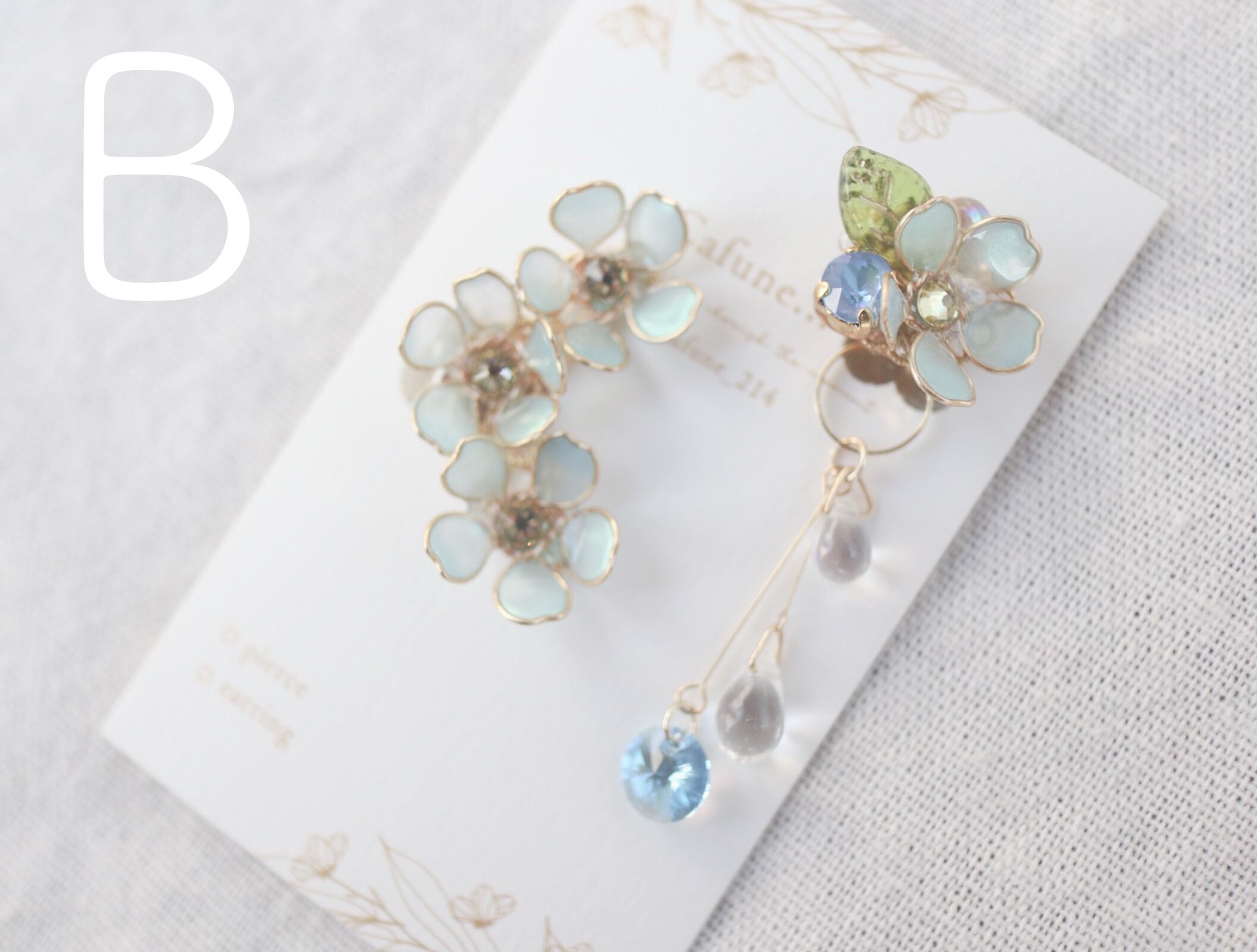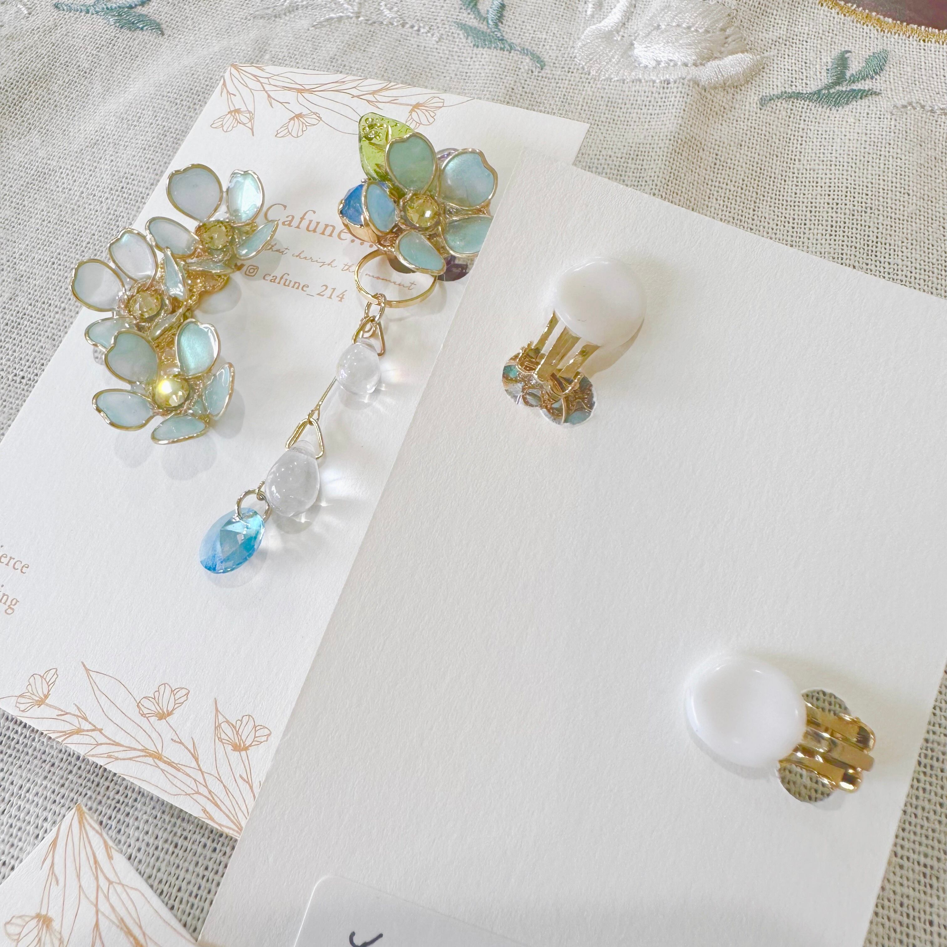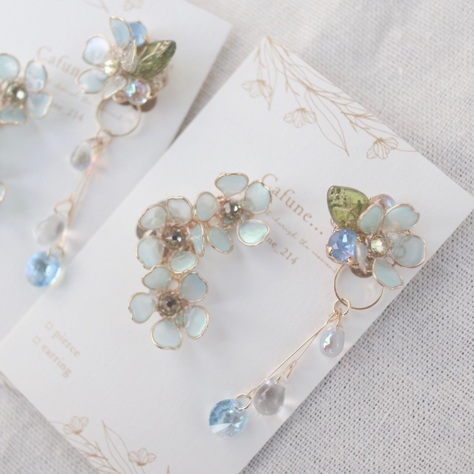 淡く、パール感のあるブルーで仕上げた、小さな忘れな草のアクセサリー。