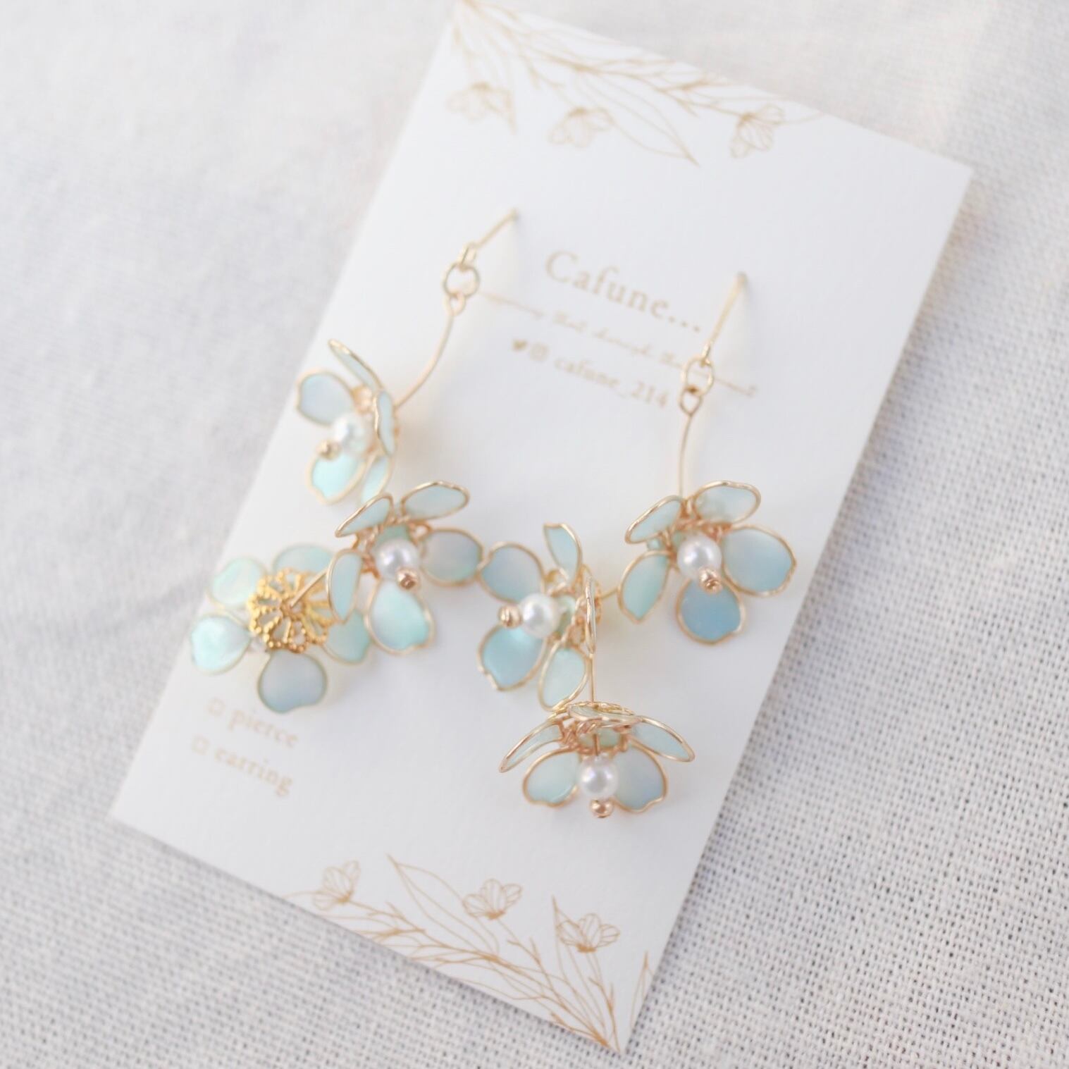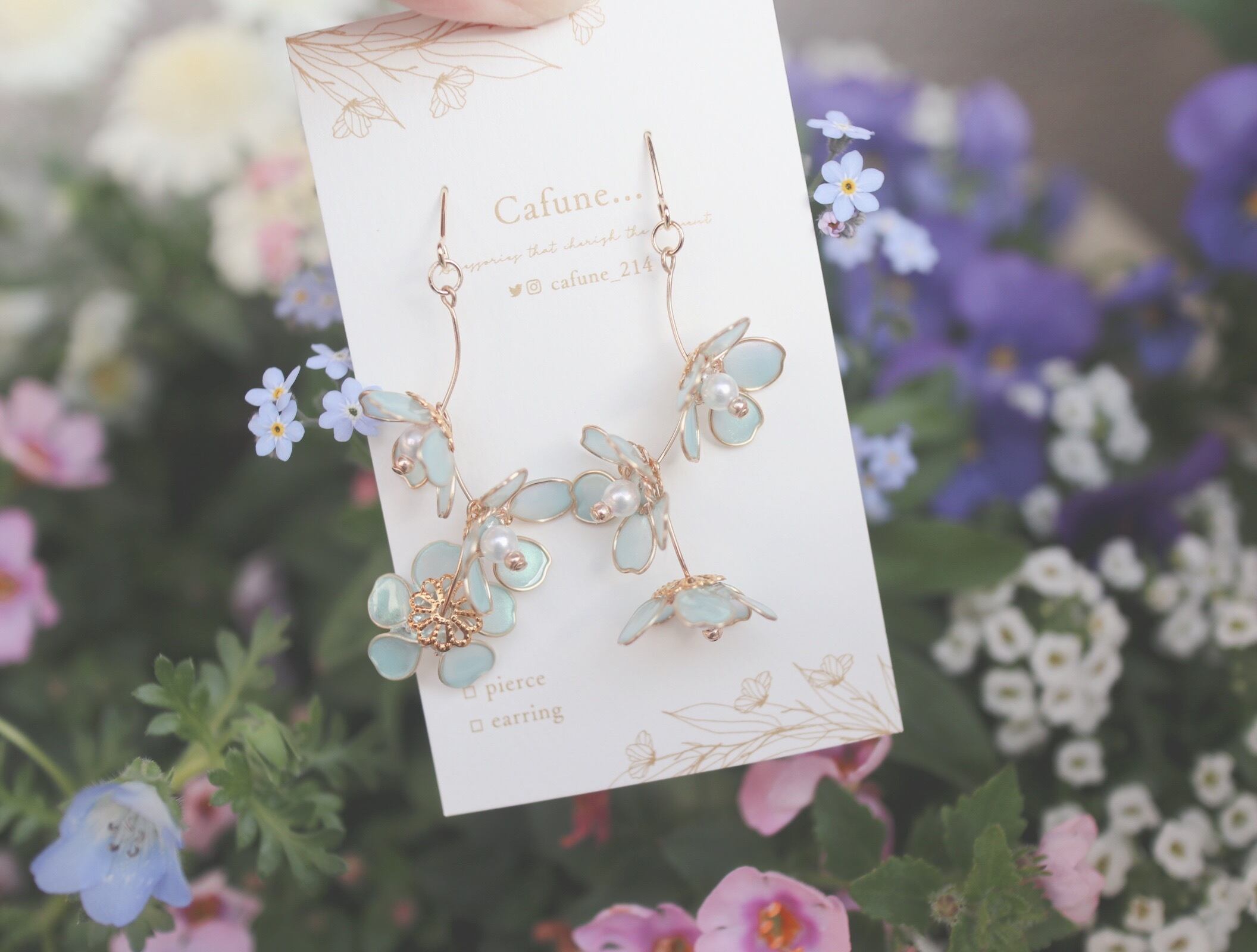 淡く、パール感のあるブルーで仕上げた、小さな忘れな草のアクセサリー。